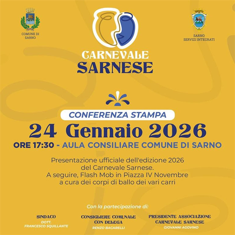 Sabato 24 gennaio 2026, alle ore 17.30, presso l’Aula Consiliare del Comune di Sarno (SA), si terrà la conferenza stampa di presentazione dell’edizione 2026 del Carnevale Sarnese, organizzato dall’Associazione Carnevale Sarnese con il patrocinio del Comune di Sarno e di Sarno Servizi Integrati, che - ancor di più rispetto agli altri anni - si preannuncia come un autentico spettacolo ricco di tradizioni, musica e rappresentazioni. Da sempre il Carnevale Sarnese convoglia con molto entusiasmo e passione famiglie intere dell’intero circondario, portando nelle date prefissate migliaia di presenze nel centro cittadino. L’edizione del Carnevale 2026 di Sarno sarà spettacolare grazie ad un programma ricco di eventi. Come di consueto, sono previste le sfilate in maschera per le vie della città, accompagnate dai corpi di ballo e tanta buona musica, oltre a numerose altre sorprese. Tutti i dettagli dell’edizione 2026 del Carnevale Sarnese saranno rivelati nel corso della conferenza stampa di sabato 24 gennaio, alla quale interverranno: - Francesco Squillante, Sindaco di Sarno; - Renzo Bacarelli, Consigliere Comunale con delega; - Giovanni Agovino, Presidente dell’Associazione Carnevale Sarnese. Al termine della conferenza stampa, si terrà un Flash Mob in Piazza IV Novembre a cura dei corpi di ballo dei vari carri. Prenderanno parte al Carnevale Sarnese: Associazione Associa, Associazione Uniti per Foce, Associazione I chiacchieroni. Lorenzo Cerrato, Associazione I soliti ritardatari, Comitato Acquarossa, Associazione Fuori Orario, Comitato Fontanelle Serrazzeta, Associazione Lavorare unita, Comitato Pirocca, Associazione La rinascita e Associazione Gioventù Sarnese. Si ringraziano gli sponsor, la stampa e la cittadinanza sono invitate a partecipare. (Associazione Carnevale Sarnese)
