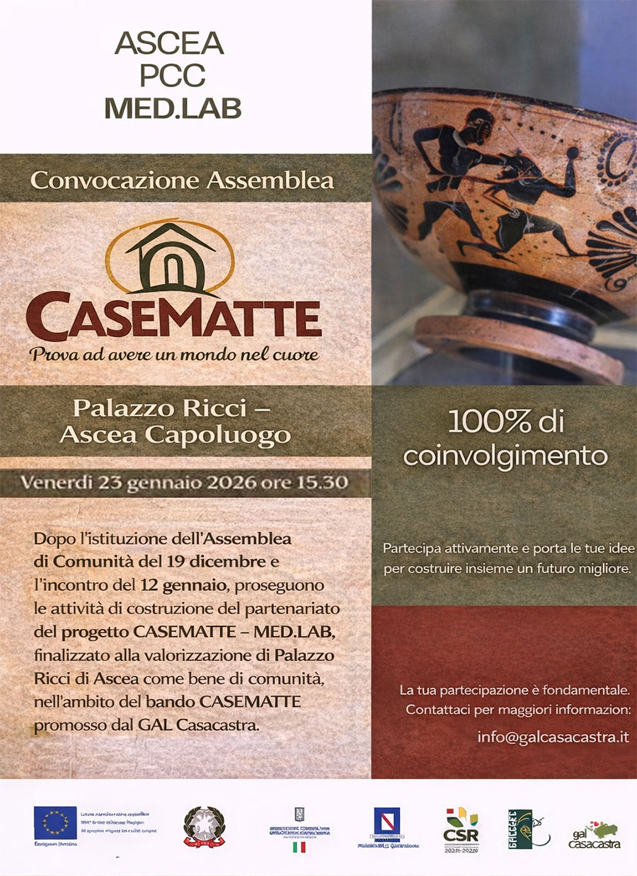 Venerdì 23 gennaio, alle ore 15.30, presso Palazzo Ricci ad Ascea Capoluogo, è convocata l'Assemblea di Comunità nell'ambito del progetto CASEMATTE - MED.LAB, proseguendo il percorso di costruzione condivisa avviato nei mesi scorsi. Il progetto CASEMATTE - MED.LAB è sviluppato nell'ambito dell'Avviso pubblico promosso dal GAL Casacastra per la selezione dei Progetti Complessi di Comunità. Con l'inserimento di Palazzo Ricci nella graduatoria dei beni candidati come beni di comunità, il progetto - dopo aver superato con esito positivo il primo step di valutazione - è entrato in una fase di approfondimento e consolidamento del percorso. Promosso dal Comune di Ascea insieme ai Parchi Archeologici di Paestum e Velia e alla Fondazione Alario, il progetto è finalizzato alla valorizzazione di Palazzo Ricci e alla definizione di una visione di sviluppo partecipata e sostenibile, fondata sul coinvolgimento attivo della comunità locale. Il percorso è realizzato con il supporto del GAL Casacastra, che si ringrazia per il sostegno e l'accompagnamento garantiti sin dall'inizio, favorendo un approccio basato sulla cooperazione territoriale e sulla centralità delle comunità locali. I precedenti incontri di comunità hanno registrato un ampio interesse e una partecipazione attiva da parte di partner istituzionali, associazioni, operatori, cittadini e giovani del territorio, confermando la volontà condivisa di costruire un progetto di sviluppo "dal basso", capace di tradurre le potenzialità locali in azioni concrete. Il percorso Casematte ha dimostrato come la qualità della partecipazione sia l'elemento decisivo per una strategia di sviluppo efficace e realmente sentita dalla popolazione. A supporto di questo percorso, inoltre, è stato istituito lo Sportello Informativo CASEMATTE presso il Comune di Ascea, pensato come punto di riferimento per la comunità. Uno spazio di ascolto, orientamento e accompagnamento, a disposizione di chiunque voglia informarsi, proporre idee, condividere bisogni o avvicinarsi al progetto. Lo Sportello Informativo è attivo: - giovedì dalle ore 9.00 alle 11.00 e dalle ore 16.00 alle 18.00 - venerdì dalle ore 11.00 alle 13.00. "CASEMATTE - MED.LAB è un progetto che guarda al futuro di Ascea attraverso un percorso realmente condiviso con la comunità" ha ribadito il primo cittadino Stefano Sansone. "Palazzo Ricci diventa un luogo vivo e rigenerativo, capace di accendere idee, energie e nuove collaborazioni sul territorio. È da qui che vogliamo costruire una visione di sviluppo partecipata, fondata sul dialogo e sulla valorizzazione delle nostre risorse materiali e immateriali". (Comune di Ascea)