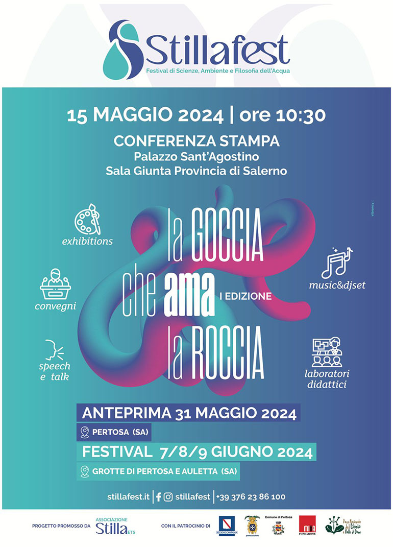 Salerno: Il 15 maggio in Provincia la presentazione di Stillafest, il Festival di Scienze, Ambiente e Filosofia dell’acqua. Salerno- Si terrà mercoledì 15 maggio a partire dalle ore 10.30, presso la sala giunta dell’Ente Provincia di Salerno, a Palazzo Sant’Agostino, la conferenza stampa di presentazione del Festival nazionale di Scienze, Ambiente e Filosofia dell’acqua, “Stillafest”, in programma il 7,8 e 9 giugno 2024, con un’anteprima il 31 maggio presso le Grotte di Pertosa-Auletta. Un festival sul futuro del pianeta, nato nel cuore del Parco Nazionale del Cilento Vallo di Diano e Alburni e che vedrà una full immersion culturale con convegni che ospiteranno relatori ed esperti di calibro internazionale, talk, didattica, lectio, performance musicali, mostre e visite guidate, organizzato dall’associazione culturale e di promozione Stilla e che gode dei patrocini della Regione Campania, della Provincia di Salerno, del Comune di Pertosa, della Fondazione Mida, dell’Associazione Grotte Turistiche Italiane, del Parco Nazionale Cilento-Vallo di Diano e Alburni, della Fondazione Il Cervene e dell’Università degli Studi di Salerno, di Legambiente Campania, della Comunità Montana Vallo di Diano, della Comunità Montana Alto Medio Sele e Tanagro, dell’Ente Riserve Naturali Foce Sele-Tanagro e Monti Eremita Marzano, del Centro italiano Riqualificazione Fluviali, del Forum dei Giovani della Regione Campania, dell’Associazione Italiana di Oceanologia e Limnologia e di Assofrantoi Campania. Alla conferenza stampa che si terrà mercoledì 15 maggio prenderanno parte tra gli altri, il Presidente della Provincia di Salerno, Franco Alfieri, il consigliere provinciale con delega al turismo, Pasquale Sorrentino, il presidente dell’associazione Stilla, Giandomenico Maria Scelzo, esperti e i sindaci. Durante l’evento, verrà presentato al pubblico e alla stampa, il programma di incontri, convegni, laboratori e visite guidate previste nei giorni del festival che avrà come tema l’acqua con “La goccia che ama la roccia”. (Mariateresa Conte)