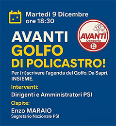 Avanti Golfo di Policastro! Per (ri)scrivere l´agenda del Golfo da Sapri, insieme. Il Partito Socialista Italiano – Coordinamento del Golfo di Policastro e la Sezione PSI di Sapri annunciano l’organizzazione di un incontro pubblico che si terrà martedì 9 dicembre alle ore 18:30 presso il Maskò Café di Sapri. L’appuntamento, dal titolo “Avanti Golfo di Policastro! – Per (ri) scrivere l’agenda del Golfo da Sapri insieme”, vedrà la partecipazione del Segretario nazionale del Partito Socialista Italiano Enzo Maraio, dei dirigenti territoriali, degli amministratori socialisti e di tutta la cittadinanza interessata a contribuire al futuro del comprensorio. L’incontro sarà un momento di confronto aperto e costruttivo, pensato per mettere al centro le esigenze del territorio e per avviare un percorso condiviso di ascolto, progettazione e rilancio del Golfo di Policastro. Temi come sviluppo locale, infrastrutture, sanità, politiche giovanili, turismo sostenibile e qualità dei servizi saranno al centro del dialogo tra rappresentanti istituzionali e comunità. Il PSI invita cittadini, associazioni, operatori economici e tutte le realtà locali a prendere parte all’iniziativa, con l’obiettivo di costruire insieme una nuova agenda di priorità, idee e proposte per il futuro del Golfo. (Gianfrancesco Caputo - Coordinamento del Golfo di Policastro - Antonio Pisani - Sezione PSI Sapri)