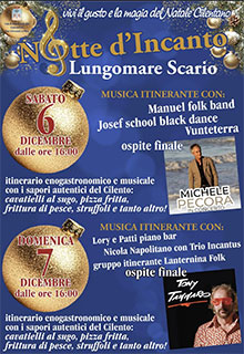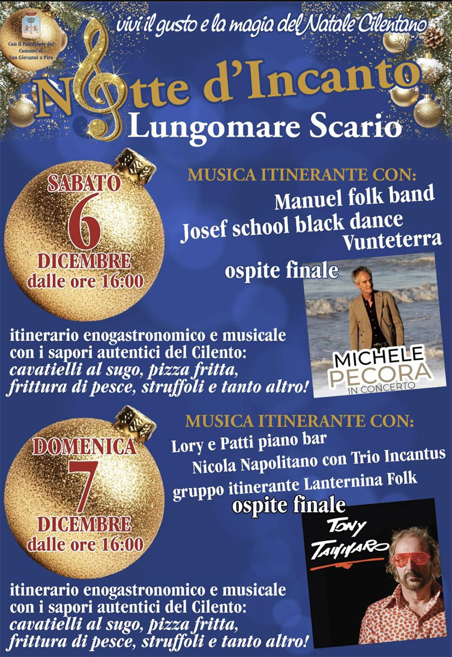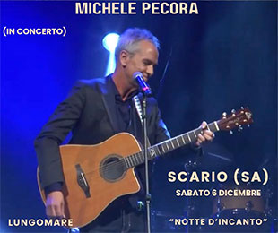 Vi aspetto domani 6 dicembre a Scario (SA) sull’incantevole lungomare, per un grande concerto con band al completo. 2 ore circa di canzoni, per rivivere insieme quei momenti che ci hanno accompagnato in tutti questi anni. In scaletta non mancheranno: Era lei, Te ne vai, Vestita di bianco, Me ne andrò, e poi e poi…tante altre... Ma domani sarà anche una grande festa di profumi, sapori e tradizioni, in quel Cilento pieno di storia e cultura. Grazie all’amico Pino Scarano, (organizzatore dell’evento) al sindaco e a tutta l’amministrazione comunale di San Giovanni a Piro, all’Ass.ne “Notte D’Incanto” per l’invito e la disponibilità. Grazie in anticipo a tutti voi che domani sarete lì con noi, per una serata da non perdere. Vi aspettiamo! (Michele Pecora)
