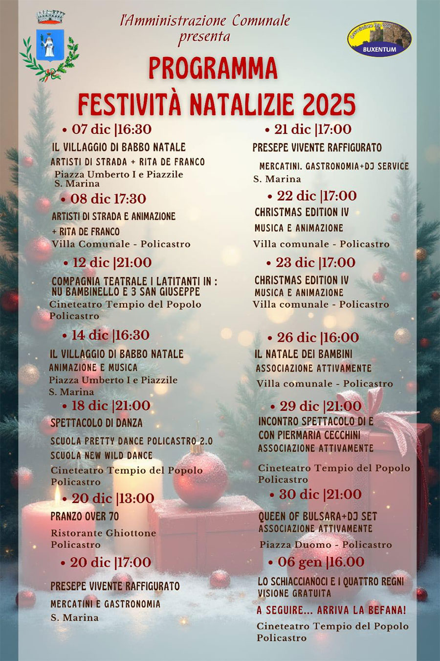 Vibonati – I Mercatini di Natale “Dal Borgo al Mare” si sono rivelati un grande successo, attirando tantissimi visitatori. L'evento, che si è svolto nel suggestivo scenario di Vibonati, ha messo in mostra una vasta gamma di espositori, offrendo prodotti artigianali, specialità gastronomiche e regali unici nel loro genere. I mercatini hanno avuto luogo in un'atmosfera festiva e accogliente, con eventi che hanno intrattenuto grandi e piccini. Dalla musica, passando per il cinema destinato ai ragazzi ,ogni momento è stato pensato per celebrare la magia del Natale. “È stato straordinario vedere così tanta partecipazione e entusiasmo da parte della comunità e dei visitatori,” ha dichiarato il sindaco di Vibonati. “Questi mercatini non sono solo un'opportunità per sostenere il territorio ma anche un momento di condivisione e gioia per tutti.” I Mercatini di Natale “Dal Borgo al Mare” continueranno a offrire eventi e sorprese in tutti i week end fino al prossimo 4 Gennaio, rendendo questo Natale ancora più speciale. Non perdere l'occasione di visitare Vibonati e immergerti nella magica atmosfera natalizia! Oggi appuntamento sul Lungomare di Villammare dalle ore 10:00 con Artigianato e prodotti tipici & Stand gastronomici con delizie tradizionali. (Comune di Vibonati)