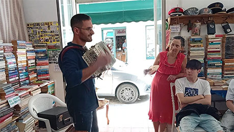 Il pluricampione mondiale di fisarmonica diatonica incanta gli studenti che partecipano ai laboratori emozionali organizzati dalla Proloco Sapri diretta da Luana Ficarra. Il maestro Alessandro Gaudio ospite questa mattina alla Borsa della cultura ha regalato un saggio delle sue grandi doti artistiche. Nel corso del laboratorio che ha parlato della transumanza (dal 2019 Patrimonio dell'Umanità)e della musica popolare, dopo aver ricordato con piacere di essere stato un vecchio allievo del 'Leonardo da Vinci ', ha deliziato i giovani studenti accompagnati dalla professoressa Brigida Cerbasi con belle melodie del passato, sfoderando virtuosismi di alta scuola. E' stata apprezzata anche l'esibizione che ha coinvolto un giovane studente dell'ITCG diretto dal Preside Corrado Limongi. I futuri appuntamenti alla Borsa della cultura sulla memoria storica, non solo del nostro territorio: domani (giovedì 18 settembre) 'I luoghi e i personaggi'; venerdì mattina 'La Spedizione dei Trecento' (ospite la nuova Spigolatrice di Sapri), e da lunedì prossimo con altri laboratori sul Novecento: il Secolo che non tramonta mai. (Mario Fortunato)  Alessandro Gaudio
