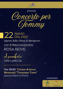 A Morigerati il concerto lirico con il mezzosoprano Rosa Bove in ricordo di Tommaso Torre. Il belcanto incontra l'emozione, con un paesaggio unico a fare da cornice. Il 22 agosto, il sagrato della chiesa di Morigerati, si trasformerà in un palcoscenico sotto le stelle per una serata che unisce musica e ricordi. Protagonista sarà il canto lirico con il mezzosoprano Rosa Bove, che incanterà il pubblico con la sua voce, accompagnata al pianoforte da Cira Lariccia. Il concerto promette di essere un viaggio emozionale attraverso un repertorio ricco e variegato, nel ricordo di Tommaso Torre, a quattro anni dalla sua prematura scomparsa. Il concerto lirico "per Tommy" si terrà alle ore 21 in piazza Chiesa. La serata proseguirà alle ore 22:30 in Piazza Piano la Porta con il torneo di bocce "Memorial Tommaso Torre". L'intera manifestazione è organizzata dalla Cooperativa Iride. (Marianna Vallone)