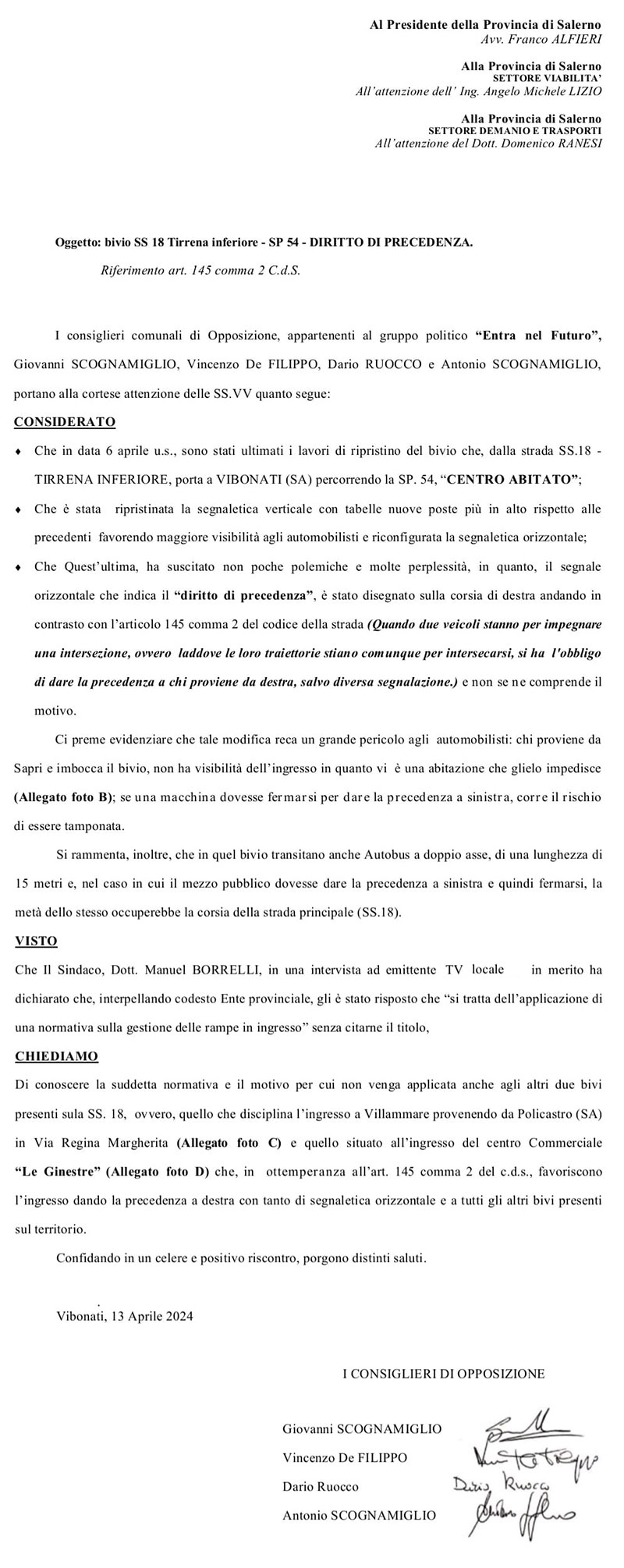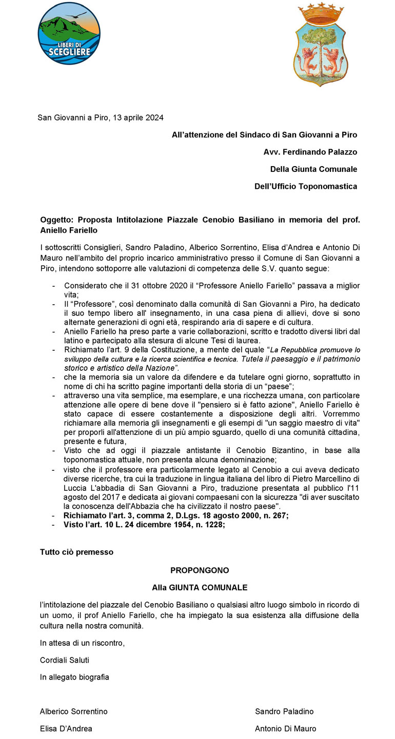 Gruppo d'opposizione Liberi di Scegliere: Intitolazione del piazzale del Cenobio Basiliano al Prof. Aniello Fariello L'intitolazione di un luogo di cultura è un'operazione che richiede un'attenta riflessione, a maggior ragione se nel "posto" in questione affondano le radici di una comunità, la storia che prende forma e ci conduce fino ai giorni d'oggi. "Attraverso una vita semplice, ma esemplare, e una ricchezza umana, con particolare attenzione alle opere di bene dove il "pensiero si è fatto azione", Aniello Fariello, il Professore nella storia della comunità sangiovannese ha rappresentato e rappresenta ancora oggi un punto di riferimento per quanti amano la cultura" - dichiarano i Consiglieri Alberico Sorrentino, Sandro Paladino, Elisa d'Andrea e Antonio Di Mauro. "Per questa ragione come Gruppo Liberi di Scegliere, abbiamo avanzato alla Giunta Comunale di San Giovanni a Piro la proposta d''intitolazione del piazzale del Cenobio Basiliano o qualsiasi altro luogo simbolo in ricordo di un uomo, il prof Aniello Fariello, che ha impiegato la sua esistenza alla diffusione della cultura nella nostra comunità". L'auspicio - concludono i Consiglieri - è che la Giunta Palazzo e l'intero Consiglio Comunale possano avallare una proposta che raccoglie la sensibilità di quanti hanno conosciuto il Prof. Aniello Fariello e rappresentare per i giovani di oggi un "saggio maestro di vita". San Giovanni a Piro, 13/04/2024. I consiglieri del Gruppo «Liberi di Scegliere» Sandro Paladino Elisa D'Andrea Antonio Di Mauro Alberico Sorrentino