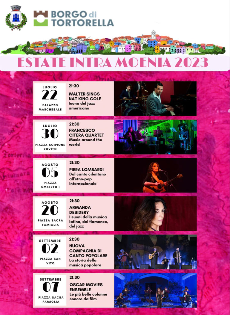 Appuntamento domani, 30 luglio, nella suggestiva cornice di Piazza Scipione Rovito, alle 21:30. Dopo il successo della serata che ha aperto il cartellone dell'Estate Intra Moenia con il cantante jazz napoletano, Walter Ricci, che ha reso omaggio all'icona del jazz americano, Nat King Cole, con una performance indimenticabile, Tortorella è pronta ad ospitare un'altra serata di musica ed emozioni. Il 30 luglio, nella suggestiva cornice di Piazza Scipione Rovito, alle 21:30, il Francesco Citera Quartet ci farà viaggiare attraverso la "Music around the world", regalando un'esperienza musicale unica. Un viaggio musicale attraverso brani della tradizione e d’autore di svariati paesi del mondo, un viaggio intorno al mondo guidato dalla fisarmonica cilentana e dall’anima blues di Francesco Citera, che comincerà dall’America Latina con Sertao, passando per News Real, sbarcando in Europa, e precisamente in Irlanda con The Musical Priest. L'Estate Intra Moenia, organizzata dal Comune di Tortorella, con la direzione artistica di Tonino Valletta, porta la musica internazionale tra le suggestive mura storiche, dal Palazzo Marchesale alle piazze del borgo, scenari magici per accogliere artisti di fama internazionale. I prossimi appuntamenti sono il 5 agosto, alle 21:30, in Piazza Umberto I, l’artista cilentana Piera Lombardi, il 20 agosto, in Piazza Sacra Famiglia, alle 21:30, Armanda Desidery, il 2 settembre, in Piazza San Vito, alle 21:30, la Nuova Compagnia di Canto Popolare e il 7 settembre, Piazza Sacra Famiglia, alle 21:30, concluderà la rassegna estiva l'Oscar Movies Ensemble. Per ulteriori informazioni: 0973 374366. (Marianna Vallone)