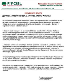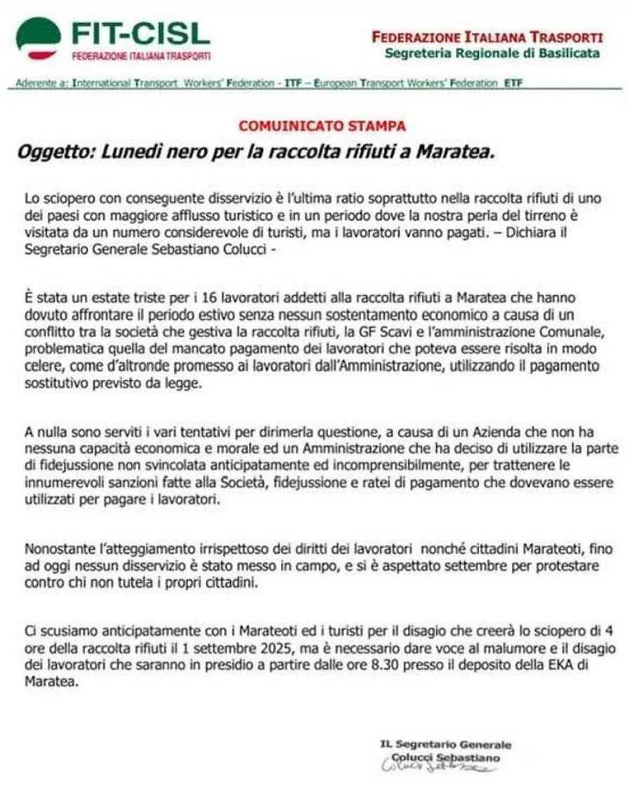 Sciopero di 4 ore della raccolta rifiuti indetto per lunedì 1 settembre 2025 dalla sigla sindacale FIT-CISL.