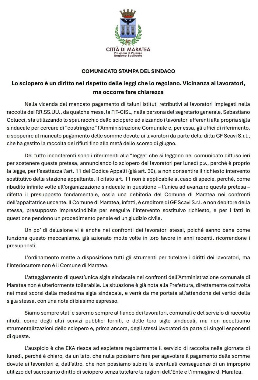Comunicato stampa del sindaco Lo sciopero è un diritto nel rispetto delle leggi che lo regolano. Vicinanza ai lavoratori, ma occorre fare chiarezza. Nella vicenda del mancato pagamento di taluni istituti retributivi ai lavoratori impiegati nella raccolta dei RR.SS.UU., da qualche mese, la FIT-CISL, nella persona del segretario generale, Sebastiano Colucci, sta utilizzando lo spauracchio dello sciopero ed aizzando i lavoratori afferenti alla propria sigla sindacale per cercare di “costringere” l’Amministrazione Comunale e, per essa, gli uffici di riferimento, a sopperire al mancato pagamento delle somme dovute ai lavoratori da parte della ditta GF Scavi S.r.l., che ha gestito la raccolta dei rifiuti fino alla metà dello scorso mese di giugno. Del tutto inconferenti sono i riferimenti alla “legge” che si leggono nel comunicato diffuso ieri per sostenere questa pretesa, annunciando lo sciopero dei lavoratori per lunedì p.v., perché è proprio la legge, per l’esattezza l’art. 11 del Codice Appalti (già art. 30), a non consentire il richiesto intervento sostitutivo della stazione appaltante. Il citato art. 11 non è applicabile al caso di specie, perché, come ribadito infinite volte all’organizzazione sindacale in questione – l’unica ad avanzare questa pretesa – difetta il presupposto fondamentale, ossia una debitoria del Comune di Maratea nei confronti dell’appaltatrice uscente. Il Comune di Maratea, infatti, è creditore di GF Scavi S.r.l. e non debitore della stessa, presupposto imprescindibile per eseguire l’intervento sostituivo richiesto, e per i fatti in questione pendono un procedimento penale ed un giudizio civile. Un po’ di delusione vi è anche nei confronti dei lavoratori stessi, poiché sanno bene come funziona questo meccanismo, già azionato molte volte in loro favore in anni recenti, ricorrendone i presupposti. L’ordinamento mette a disposizione tutti gli strumenti per tutelare i diritti dei lavoratori, ma l’interlocutore non è il Comune di Maratea. L’atteggiamento di quest’unica sigla sindacale nei confronti dell’Amministrazione comunale di Maratea non è ulteriormente tollerabile. La situazione è già nota alla Prefettura, direttamente coinvolta nei mesi scorsi dalla medesima sigla sindacale, e verrà da me portata all’attenzione dei vertici della sigla stessa, con una nota di biasimo espresso. Siamo sempre stati e saremo sempre al fianco dei lavoratori, comunali e del servizio di raccolta rifiuti, come degli altri servizi pubblici forniti, e delle loro sigle sindacali, ma non accettiamo strumentalizzazioni dello sciopero e, prima ancora, degli stessi lavoratori da parte di singoli esponenti di queste. L’auspicio è che EKA riesca ad espletare regolarmente il servizio di raccolta nella giornata di lunedì, perché è chiaro, da un lato, che nulla possiamo fare per agevolare il pagamento delle somme dovute ai lavoratori e, dall’altro, che non possiamo subire le eventuali conseguenze di un improprio utilizzo del sacrosanto diritto di sciopero senza tutelare le ragioni dell’Ente e l’immagine di Maratea. Avv. Cesare Albanese - Sindaco di Maratea (Comune di Maratea)