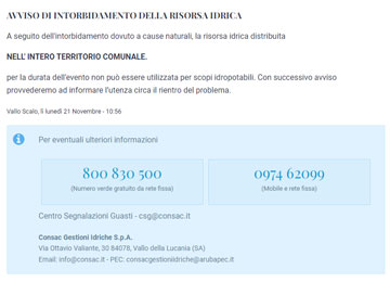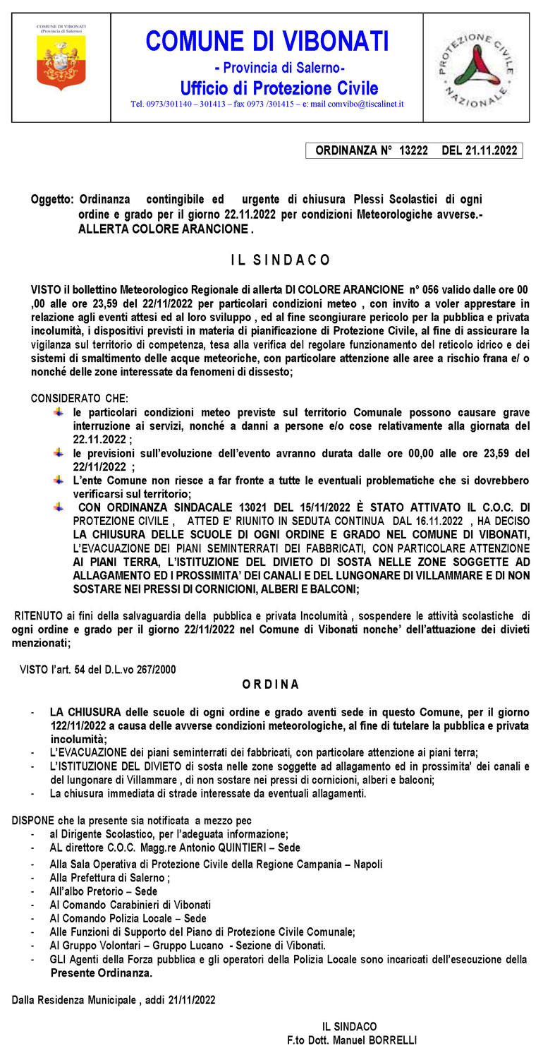 L’ultimo bollettino meteo pubblicato in data odierna dalla centrale regionale di Protezione Civile Regione Campania Soru definisce per la nostra zona un livello di allerta arancione dalle ore 00:00 alle ore 23:59 di domani martedì 22 novembre. Sono previste precipitazioni diffuse, anche a carattere di rovescio e temporale, localmente di moderata o forte intensità. Venti tendenti a molto forti con raffiche da sud-sud-ovest. Mare tendente a molto agitato o grosso con mareggiate lungo le coste esposte. Il COC, attivato e riunito in seduta continua dalla giornata del 16.11.2022, ha deciso: - di chiudere le scuole di ogni ordine e grado - l'evacuazione dei piani seminterrato - l’istituzione del divieto di sosta nelle zone soggette ad allagamento ed in prossimità dei canali e del lungomare. Si prega di non uscire di casa se non per situazioni di necessità e di non sostare nei pressi di cornicioni, alberi e balconi. Seguiranno ulteriori aggiornamenti. Per richieste di assistenza i cittadini potranno scrivere alla mail: polizialocalevibonati@gmail.com - protezionecivilevibonati@gmail.com (Comune di Vibonati)