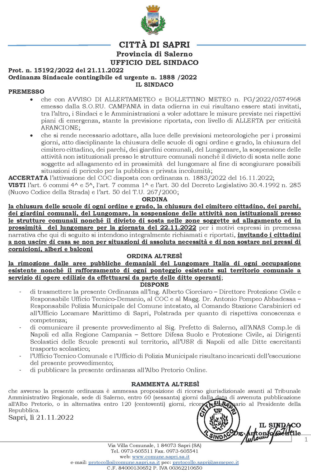 Attenzione L’ultimo bollettino meteo pubblicato in data odierna dalla centrale regionale di Protezione Civile Regione Campania Soru definisce per la nostra zona un livello di allerta arancione dalle ore 00:00 alle ore 23:59 di domani martedì 22 novembre. Sono previste precipitazioni diffuse, anche a carattere di rovescio e temporale, localmente di moderata o forte intensità. Venti tendenti a molto forti con raffiche da sud-sud-ovest. Mare tendente a molto agitato o grosso con mareggiate lungo le coste esposte. Il COC, attivato e riunito in seduta continua dalla giornata del 16.11.2022, ha deciso di chiudere le scuole di ogni ordine e grado, di chiudere il cimitero comunale, i parchi, i giardini comunali, il Lungomare, di sospendere le attività non istituzionali presso le strutture comunali nonché l’istituzione del divieto di sosta nelle zone soggette ad allagamento ed in prossimità dei canali e del lungomare, di non uscire di casa se non per situazioni di necessità e di non sostare nei pressi di cornicioni, alberi e balconi. Seguiranno ulteriori aggiornamenti. Per richieste di assistenza i cittadini potranno scrivere alla mail poliziamunicipale@comune.sapri.sa.it (Comune di Sapri)