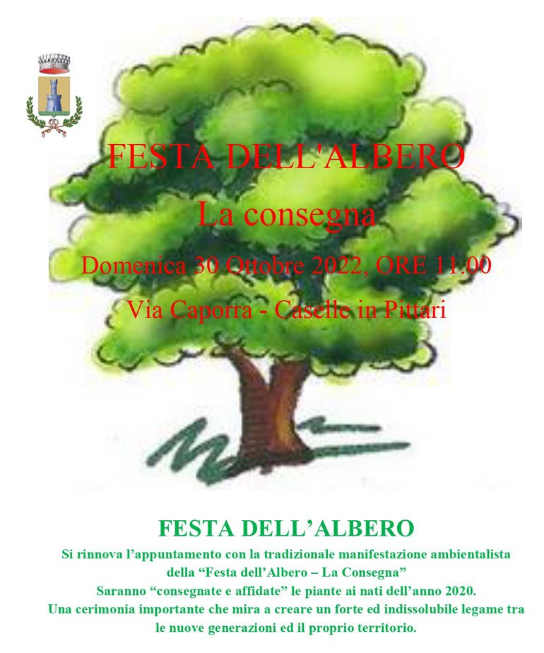 Si rinnova l'appuntamento con la tradizionale manifestazione ambientalista della "Festa dell'Albero - La Consegna" Domenica 30 Ottobre 2022, alle ore 11.00 in Via Caporra/Località Pantanella avrà luogo l'iniziativa ambientalista della "Festa dell'Albero - La Consegna", promossa ed organizzata dall'Amministrazione Comunale di Caselle in Pittari, che affiderà la "proprietà" e le cure di ben 24 alberi ai nati dell'anno 2020. Una cerimonia importante che mira a creare un forte ed indissolubile legame tra le nuove generazioni ed il proprio territorio. (Comune di Caselle in Pittari)