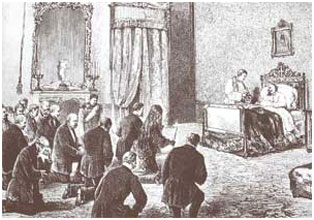 Vittorio Emanuele II mentre, il 9 gennaio 1878, riceve il sacramento dell'estrema unzione. (Fare clic sull'immagine per ingrandire)