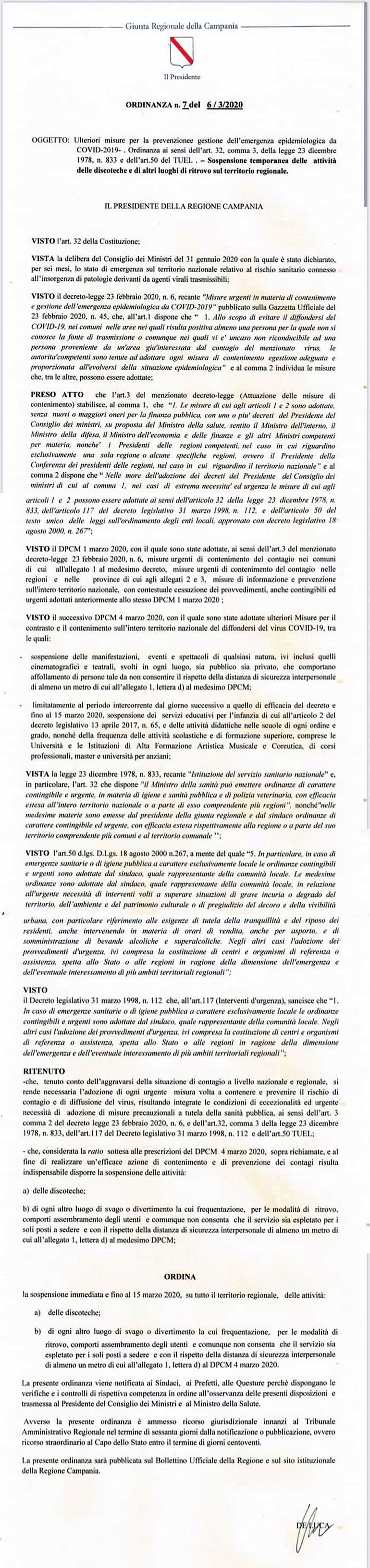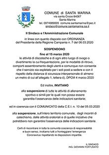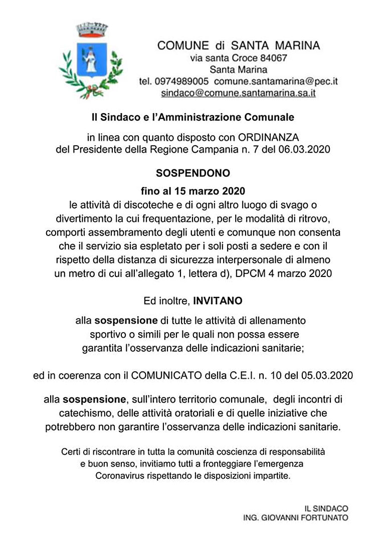 Siamo seri e responsabili stiamo a casa e non mettiamoci in viaggio. Solo così riusciremo ad uscirne! Il nuovo DPCM 07.03.2020 prevede l’allargamento della zona rossa con il divieto di ingresso e di uscita dalla regione Lombardia e dalle province di Modena, Parma, Piacenza, Reggio Emilia, Rimini, Pesaro e Urbino, Alessandria, Asti, Verbano Cusio Ossola, Vercelli, Padova, Treviso E Venezia. E’ assolutamente indispensabile rispettare le nuove disposizioni! Chiunque provenga dalle aree identificate come zone rosse e dovesse accedere al territorio comunale Vibonati è obbligato a notificare i propri spostamenti al Sindaco sulla mail info@comune.vibonati.sa.it e alla Polizia Locale sulla mail polizialocalevibonati@gmail.com, al medico di base o al pediatra, alla UOSD Prevenzione Collettiva ai numeri 0975/373642 e 0975/373680 o ai numeri attivi h24 089/693960 e 800909699. Invito le suddette persone rientranti dalla zone rosse (o rientrate negli ultimi 14 giorni), anche se asintomatiche, a non uscire dalle proprie residenze se non per casi di stretta necessità e urgenza e di non incontrare familiari anziani e/o affette da patologie croniche ovvero con stati di immunodepressione congenita o acquisita. E’ un obbligo morale e civile. #CORONAVIRUS IMPORTANTE Si ricorda che chiunque rientri dalle zone rosse (regione Lombardia e dalle province di Modena, Parma, Piacenza, Reggio Emilia, Rimini, Pesaro e Urbino, Alessandria, Asti, Verbano Cusio Ossola, Vercelli, Padova, Treviso E Venezia) senza comunicare alle autorità competenti i propri spostamenti è punito, salvo che il fatto costituisca più grave reato, ai sensi dell’articolo 650 del codice penale, come previsto dall’articolo 3, co 4, del DL 23 febbraio 2020, n. 6. Comunica che le FFOO competenti provvederanno ai controlli de quo e ad ordinare le misure richieste dal caso. (Comune di Vibonati)