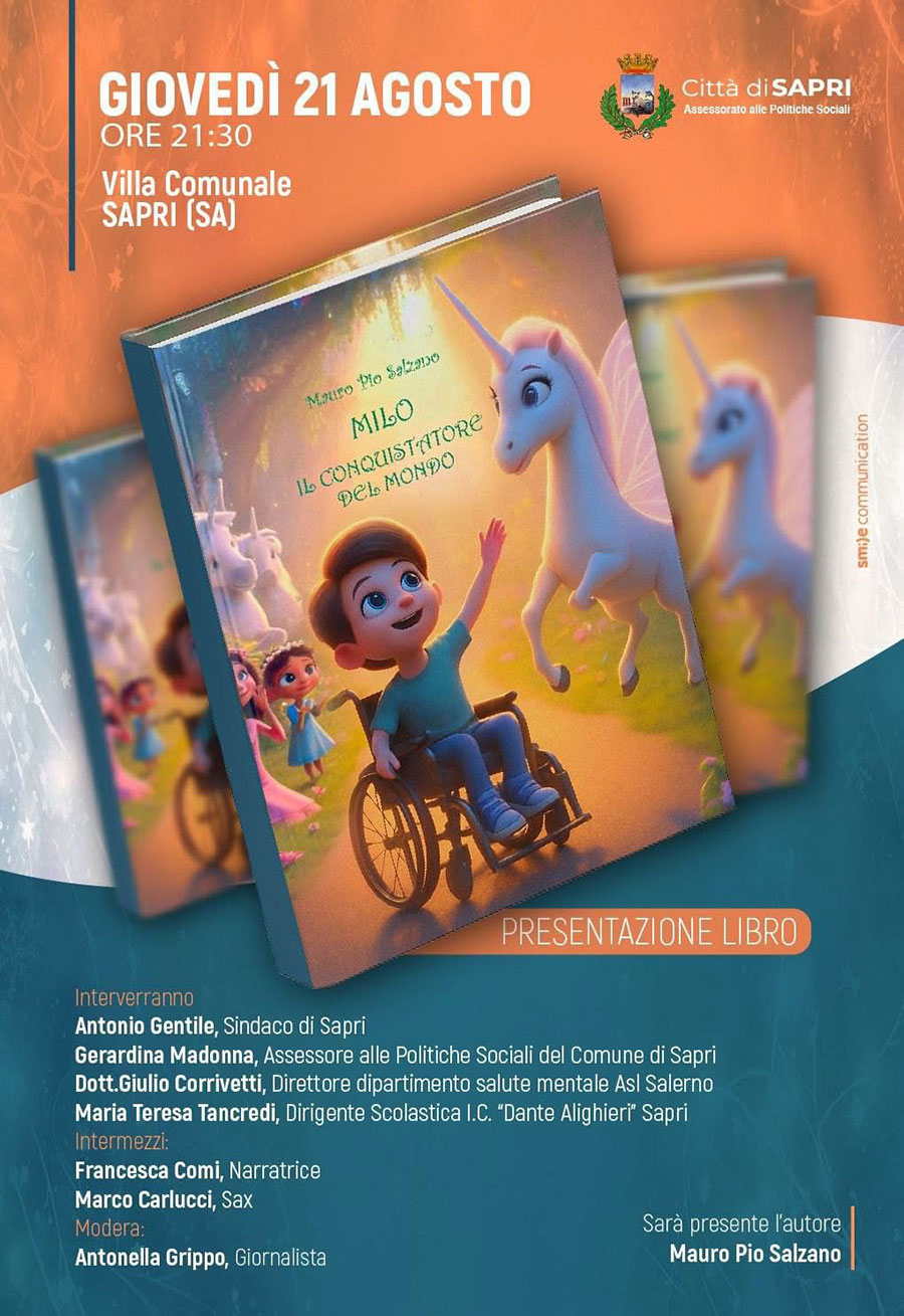 Si tratta di una bellissima fiaba dal titolo "Milo, il conquistatore del mondo": la storia di un ragazzo disabile che grazie all’immaginazione riesce a superare ogni ostacolo. La serata organizzata dal Comune di Sapri, con in testa l’Assessore alle Politiche sociali Gerardina Madonna, vedrà la partecipazione della Dirigente scolastica Maria Teresa Tancredi, del Sindaco Antonio Gentile, di Francesca Comi in qualità di narratrice e del musicicista Marco Carlucci. Modererà la nota giornalista Antonella Grippo. (Mario Fortunato)