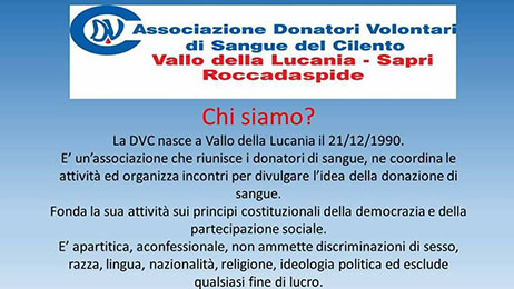 Aperta presso i locali del Presidio Ospedaliero dell'Immacolata di Sapri una nuova sede dell'Associazione Donatori Volontari di Sangue del Cilento. L'Associazione ringrazia per la disponibilità il Direttore Sanitario del P.O. di Sapri dott. Rocco Calabrese.
