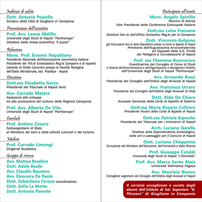 Il giorno 11/3/2017, dalle ore 9.30, presso la Sala convegni dell'ASL Napoli 2 Nord, sita in Giugliano in Campania (Napoli), alla Piazza Annunziata, si terrà un convegno sul tema "Beni culturali ed azioni di contrasto alla criminalità". L'evento, organizzato dal professore ed avvocato Leone Melillo, promosso dall'Augustissima Arciconfraternita dei Pellegrini di Napoli è stato patrocinato, tra gli altri, dal Comune di Giugliano in Campania, dal MIUR - Ufficio Scolastico Regionale per la Campania, dall'Assessorato allo sviluppo ed alla promozione del turismo della Regione Campania, dal Consiglio dell'Ordine degli Avvocati di Napoli e da quello di Nola che lo hanno anche "accreditato", ai fini della formazione continua. Il convegno, condiviso da illustri studiosi, persegue la valorizzazione dei "beni culturali", per la formazione di una coscienza civile - come dimensione possibile della scelta giuridica premiale - e si avvale della socializzazione, per una cultura della legalità, in un confronto serrato tra storia, cultura, tradizioni, identità e legalità. Temi tratti dalla Storia delle istituzioni politiche e dalla Storia delle dottrine politiche come "scenario" della scelta politica possibile. Un percorso di ricerca che deve anche considerare le azioni di contrasto alla criminalità, in senso stretto, tese a perseguire la tutela dei beni culturali, in senso materiale ed immateriale, affermando i valori comuni della collettività, incarnati dai "luoghi di cultura" dei beni culturali. Temi che accedono al Corso di Studi in Scienze dell'Amministrazione e dell'Organizzazione e Management Pubblico, ora affrontati, con rinnovato vigore, dall'Assessorato allo sviluppo ed alla promozione del turismo della Regione Campania. Un momento di riflessione che, con la modalità del dibattito, vuole favorire la partecipazione dei docenti e degli studenti delle scuole secondarie, di secondo grado, così come previsto dal patrocinio morale e dalla circolare della Dott.ssa Luisa Franzese (Direttore Regionale dell'Ufficio scolastico Regionale per la Campania) che, "in considerazione delle finalità storico - culturali, pedagogico-formative e sociali" di questo evento, ha invitato i Dirigenti Scolastici delle Scuole Secondarie di 2° grado della Città Metropolitana di Napoli a curare la diffusione del programma, per consentire la partecipazione di docenti e studenti. Un percorso di ricerca che si avvale dell'Avv. Matteo Baselice, della Dott.ssa Adele Basile, dell'Avv. Claudio Bausano, dell'Avv. Eleonora De Paola, del Dott. Sebastiano Ferone (coordinatore del gruppo di ricerca), della Dott. Sofia La Motta, del Dott. Raffaele Borzacchelli. Veniamo all'articolazione dell'evento. Dopo gli indirizzi di saluto del Dott. Antonio Poziello (Sindaco della Città di Giugliano in Campania), presenterà l'iniziativa il Prof. Avv. Leone Melillo (Università degli Studi di Napoli "Parthenope", Direttore della rivista scientifica "Il pozzo"), impegnato anche nella discussione, animata dalla relazione che sarà tenuta dal Mons. Prof. Erasmo Napolitano (Presidente Nazionale dell'Associazione canonistica italiana, Presidente del Tribunale Ecclesiastico Regionale Campano e di Appello, Docente di Diritto Canonico presso la Facoltà Teologica dell'Italia Meridionale, sez. Posillipo-Napoli). Parteciperanno alla discussione anche la Dott.ssa Elisabetta Garzo (Presidente del Tribunale di Napoli Nord), l'Avv. Corrado Matera (Assessore allo sviluppo ed alla promozione del turismo della Regione Campania), il Prof. Avv. Alberto De Vita (Università degli Studi di Napoli "Parthenope"). Parteciperanno all'evento - moderato dal Prof. Corrado Limongi (Dirigente scolastico) - anche Mons. Angelo Spinillo (Vescovo di Aversa e Vice Presidente della Conferenza Episcopale Italiana), la Dott.ssa Luisa Franzese (Direttore Generale dell'Ufficio Scolastico Regionale per la Campania), il Dott. Vincenzo Galgano (già Procuratore Generale della Repubblica presso la Corte di Appello di Napoli e Primicerio dell'Augustissima Arciconfraternita ed Ospedali della S.S. Trinità dei Pellegrini e Convalescenti di Napoli), la Prof. ssa Filomena Buonocore (Coordinatrice del Consiglio di Corso di studi in Scienze dell'Amministrazione e dell'Organizzazione e Management Pubblico dell'Università degli Studi di Napoli "Parthenope"), l'Avv. Armando Rossi (Presidente del Consiglio dell'Ordine degli Avvocati di Napoli), l'Avv. Francesco Urraro (Presidente del Consiglio dell'Ordine degli Avvocati di Nola), il Dott. Aldo De Chiara (Avvocato Generale della Corte di Appello di Salerno), la Dott.ssa Maria Rosaria Cultrera (Presidente Vicario della Corte di Appello di Napoli), la Dott.ssa Patrizia Esposito (Presidente del Tribunale per i minorenni di Napoli), l'Arch. Luciano Garella (Direttore della Soprintendenza archeologica, belle arti e paesaggio per il Comune di Napoli), il Dott. Luciano Chiappetta (Consulente del Ministero dell'Istruzione, dell'Università e della Ricerca), il Prof. Giuseppe Cataldi (Università degli Studi di Napoli "L'Orientale"), il Prof. Avv. Marco Santo Alaia (Università Telematica Pegaso), l'Avv. Maurizio Bianco (Consigliere segretario del Consiglio dell'Ordine degli Avvocati di Napoli). Il servizio accoglienza sarà curato dagli alunni dell'Istituto di Istruzione Superiore "Giovanni Minzoni" di Giugliano in Campania. Concluderà i lavori il Prof. Antimo Cesaro (Sottosegretario di Stato al Ministero dei beni e delle attività culturali e del turismo). La segreteria organizzativa dell'evento ha sede in Giugliano in Campania (Napoli), alla Piazza Annunziata n. 315, presso lo studio legale del Prof. Avv. Leone Melillo (tel/fax - 081/0491635). (Prof. Leone Melillo)